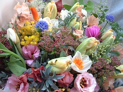 時々仕入れた花の中で、10本の中に1本だけ、あんまりにも輝いていてとって置きたくて手が出せない花、なんてのがあるのですが、(ようは惚れちゃっているのデス)そんな時は心の中で「今使わずに何時使うのだ!(>殿下)」とつぶやきながら、「そうだよね〜とっといたってダメにするだけだもんね〜あんたってスゴイよ」とお花に声をかけて使わせてもらいます。