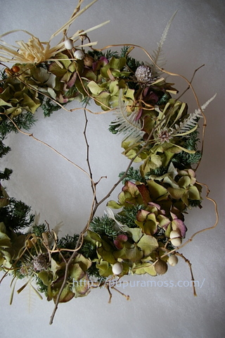 冬姿の植物たちを、散歩の合間に拾ってきてはいつかカタチにしていと思っていました。早乙女蔓のつるをいかしたいくて、全体にざっくりした感じにしました。